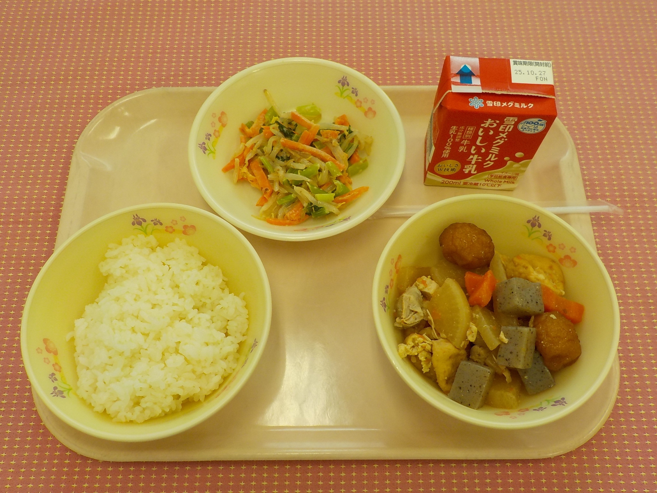 本日のメニューは、ごはん、牛乳、おでん、小松菜のおかかマヨサラダ です。