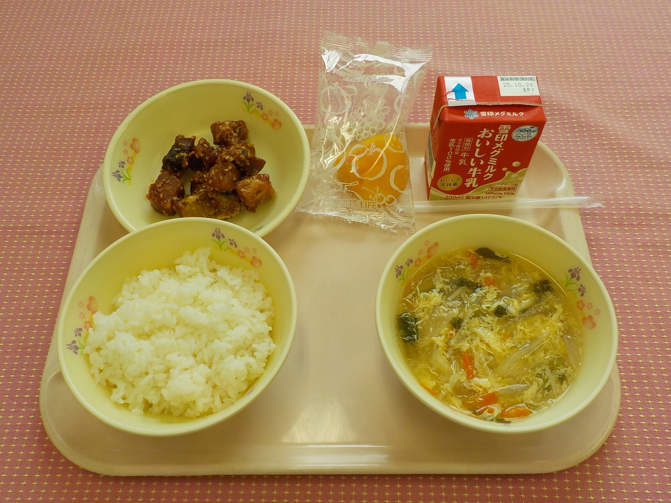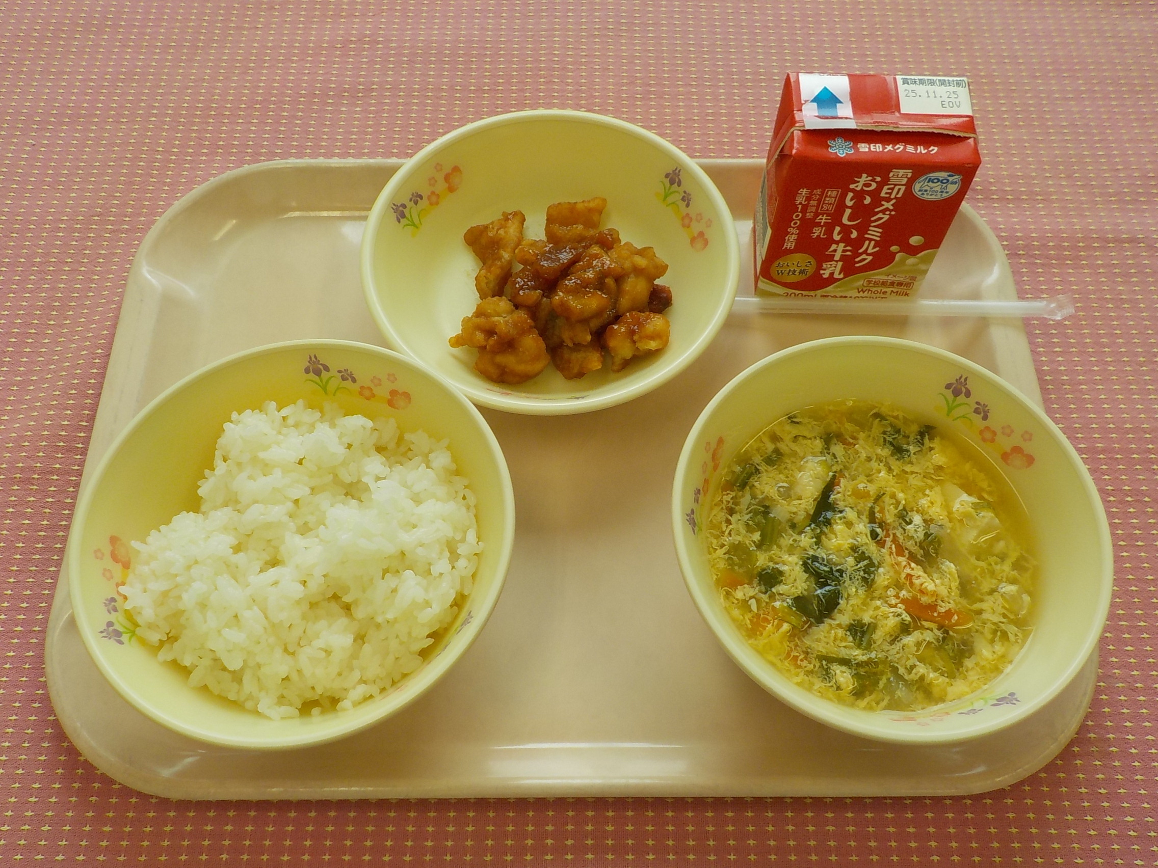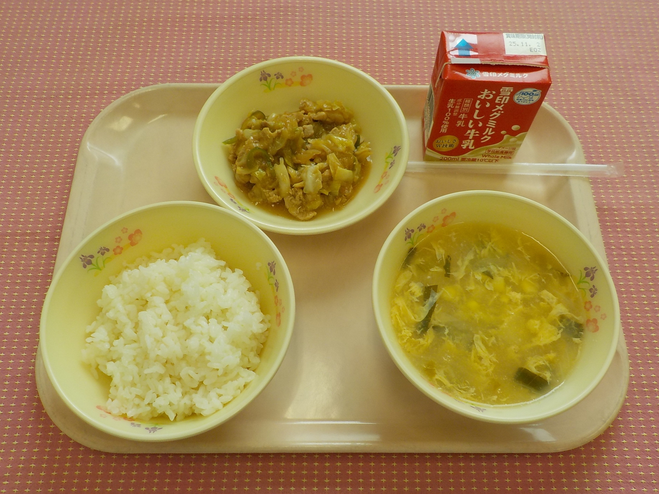 本日のメニューは、ごはん、牛乳、かきたま汁、