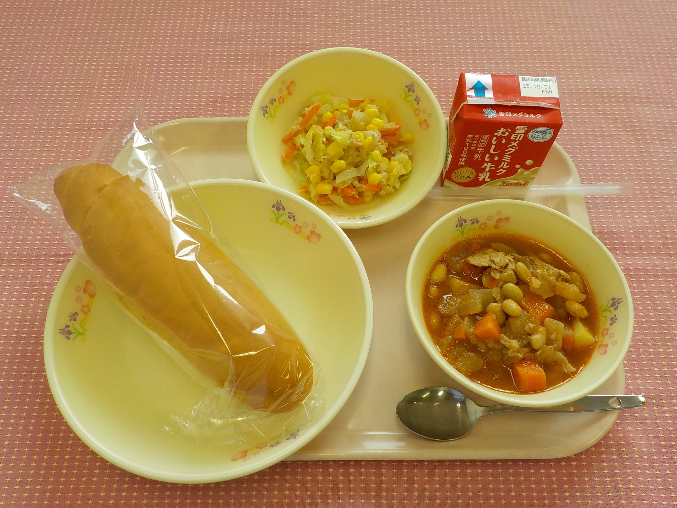 本日のメニューは、コッペパン、牛乳、ポークビーンズ、