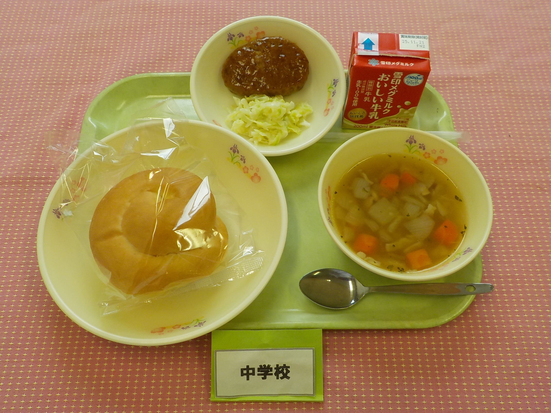 中学生は、バーガーパン、牛乳、さつまいもスープ、