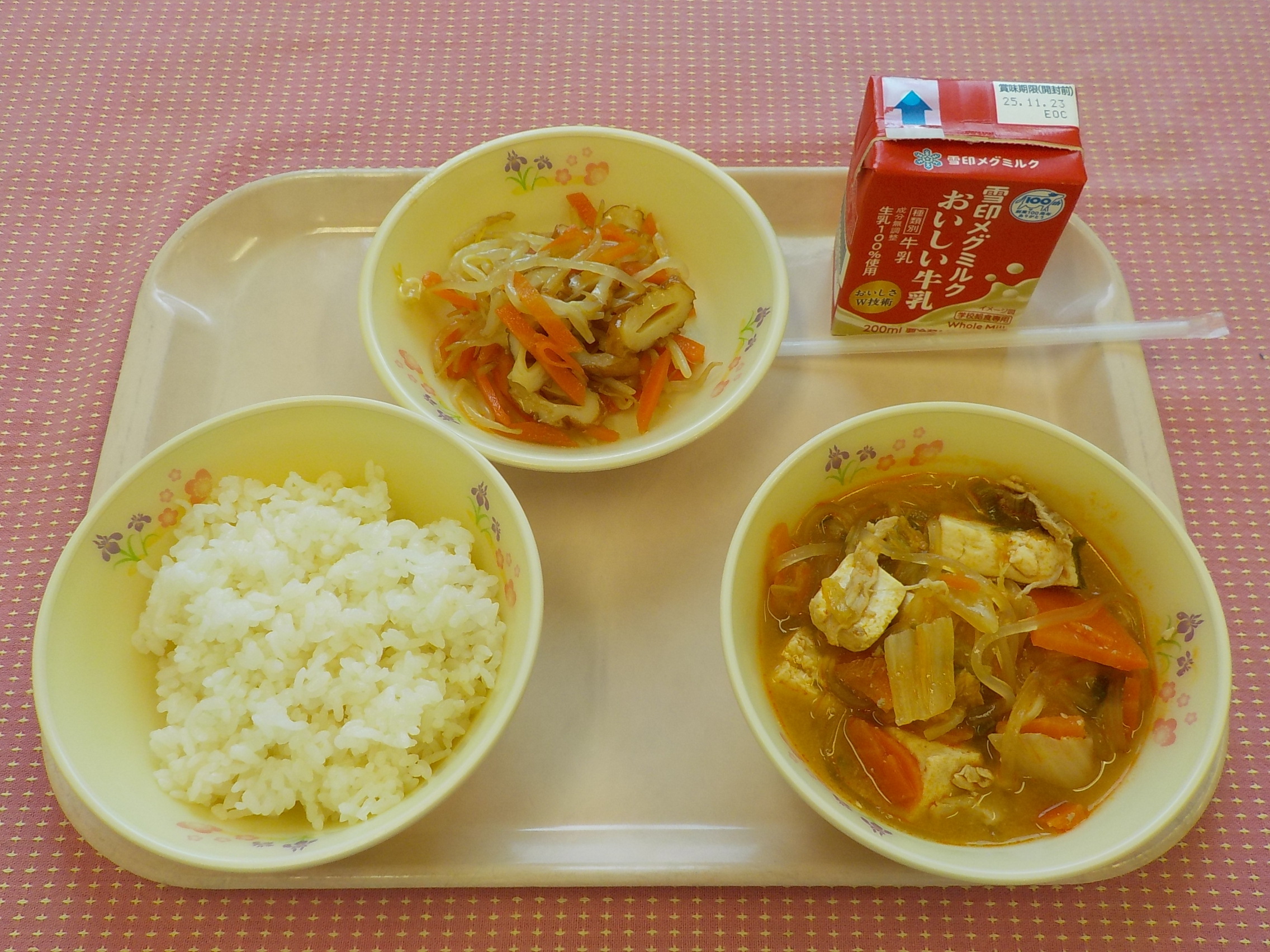本日のメニューは、ごはん、牛乳、豆腐チゲ、もやしのナムル です。