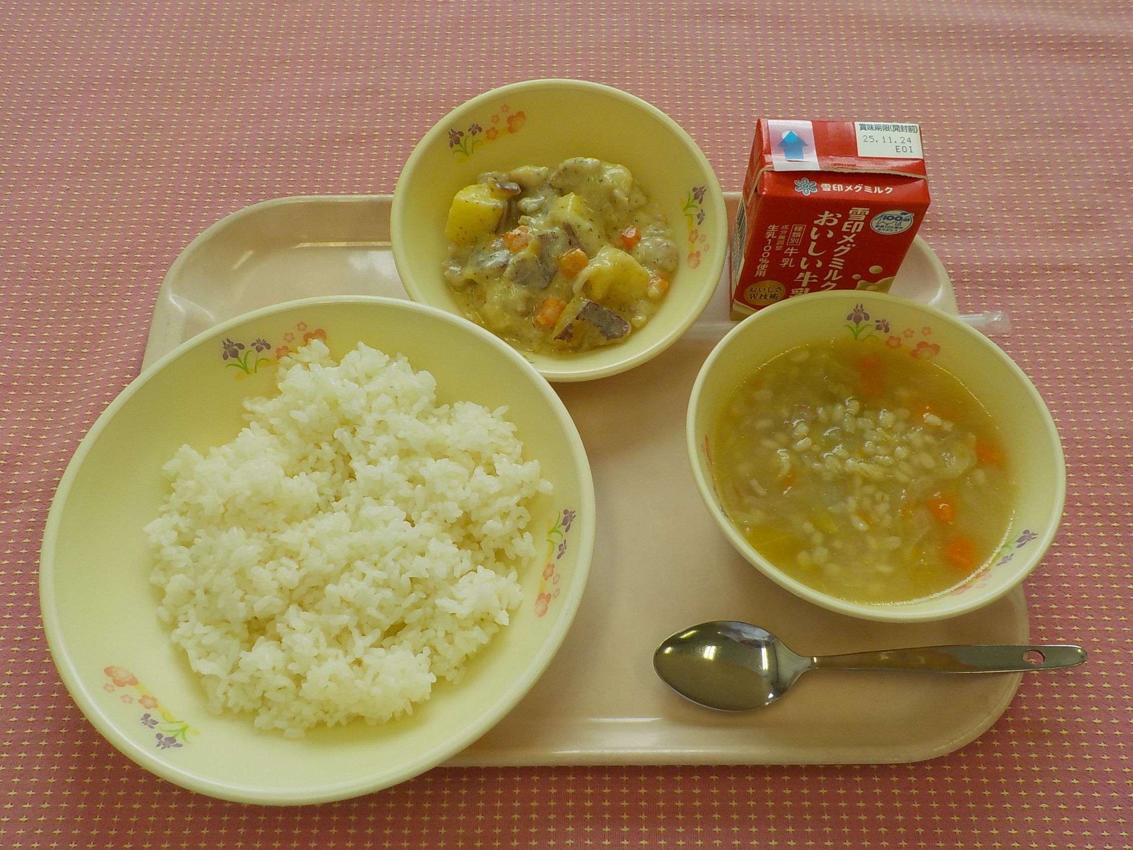 本日のメニューは、ごはん、牛乳、麦と野菜のスープ、