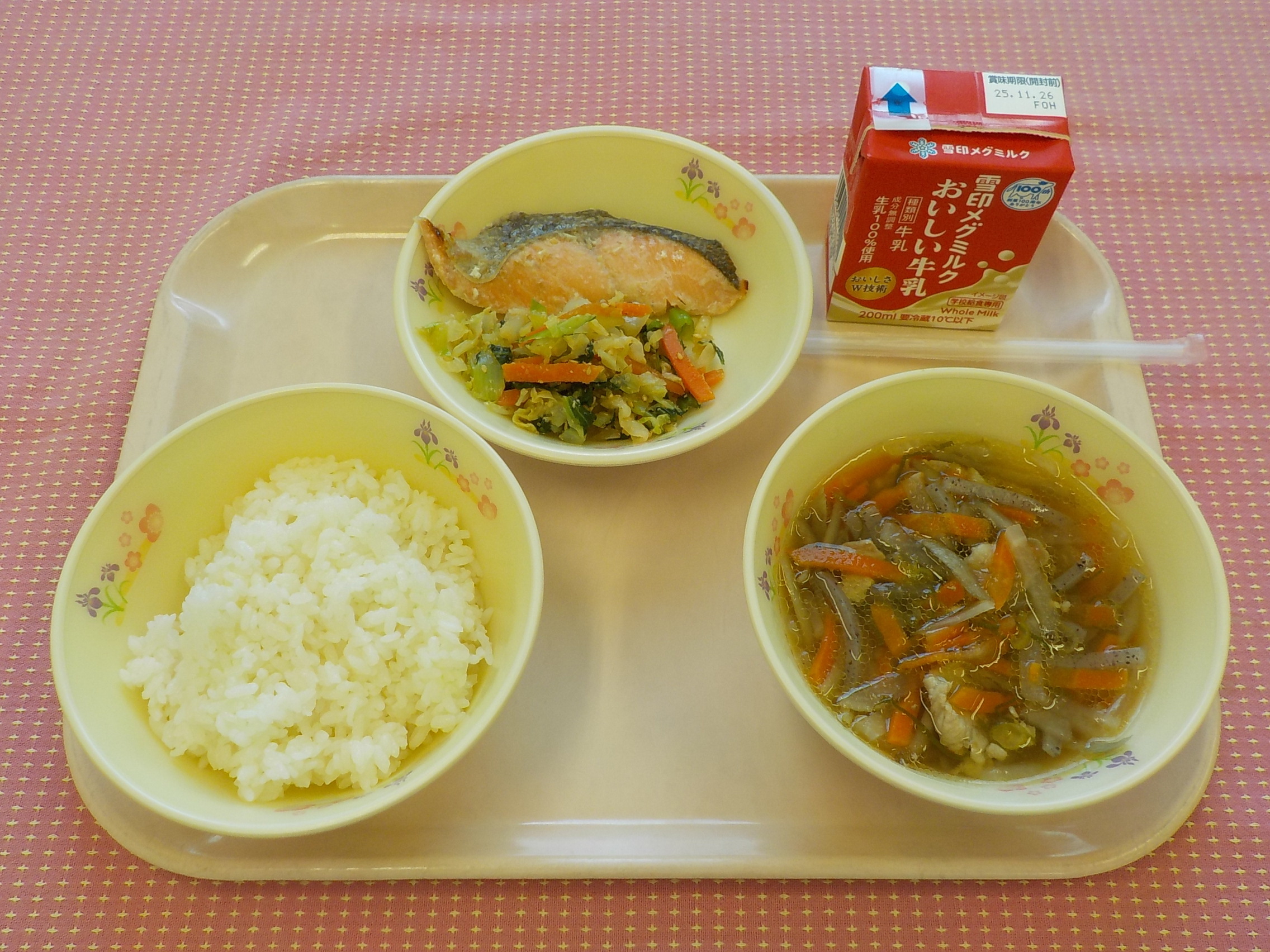本日のメニューは、ごはん、牛乳、沢煮椀、鮭の西京焼き、