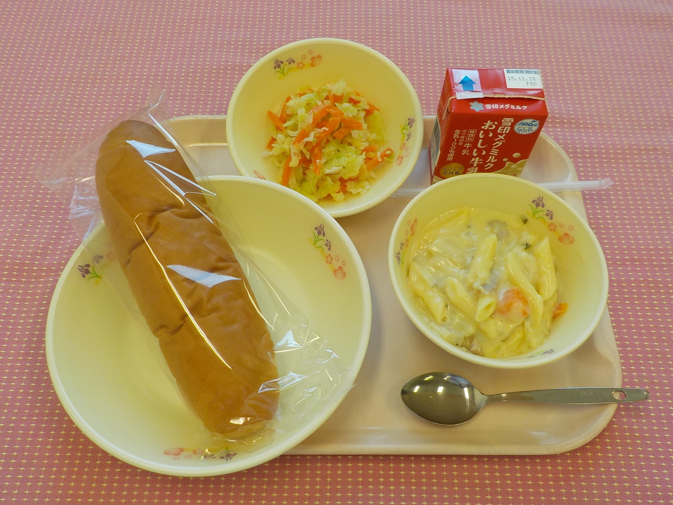 本日のメニューは、味付けパン、牛乳、ペンネときのこのシチュー、