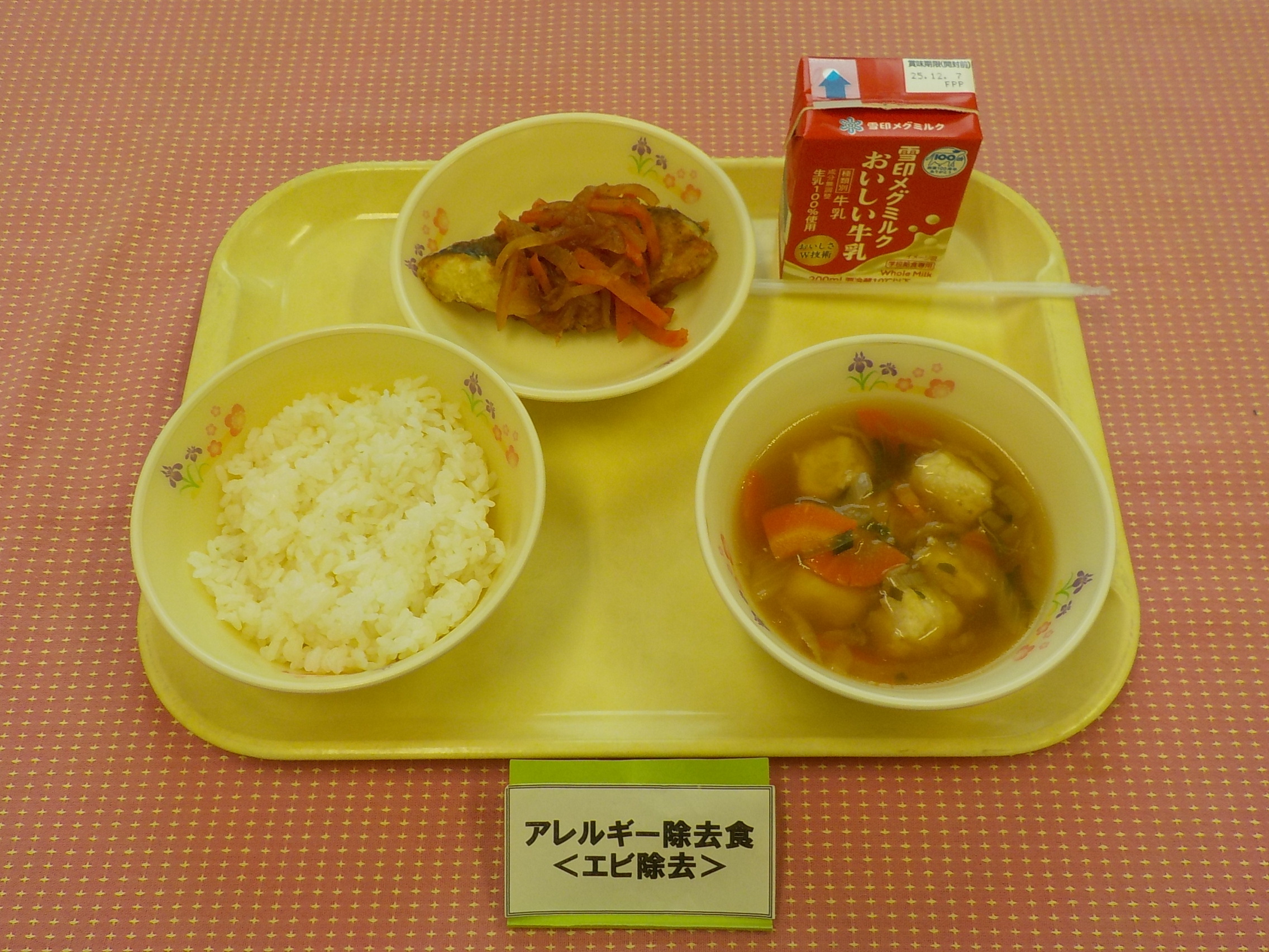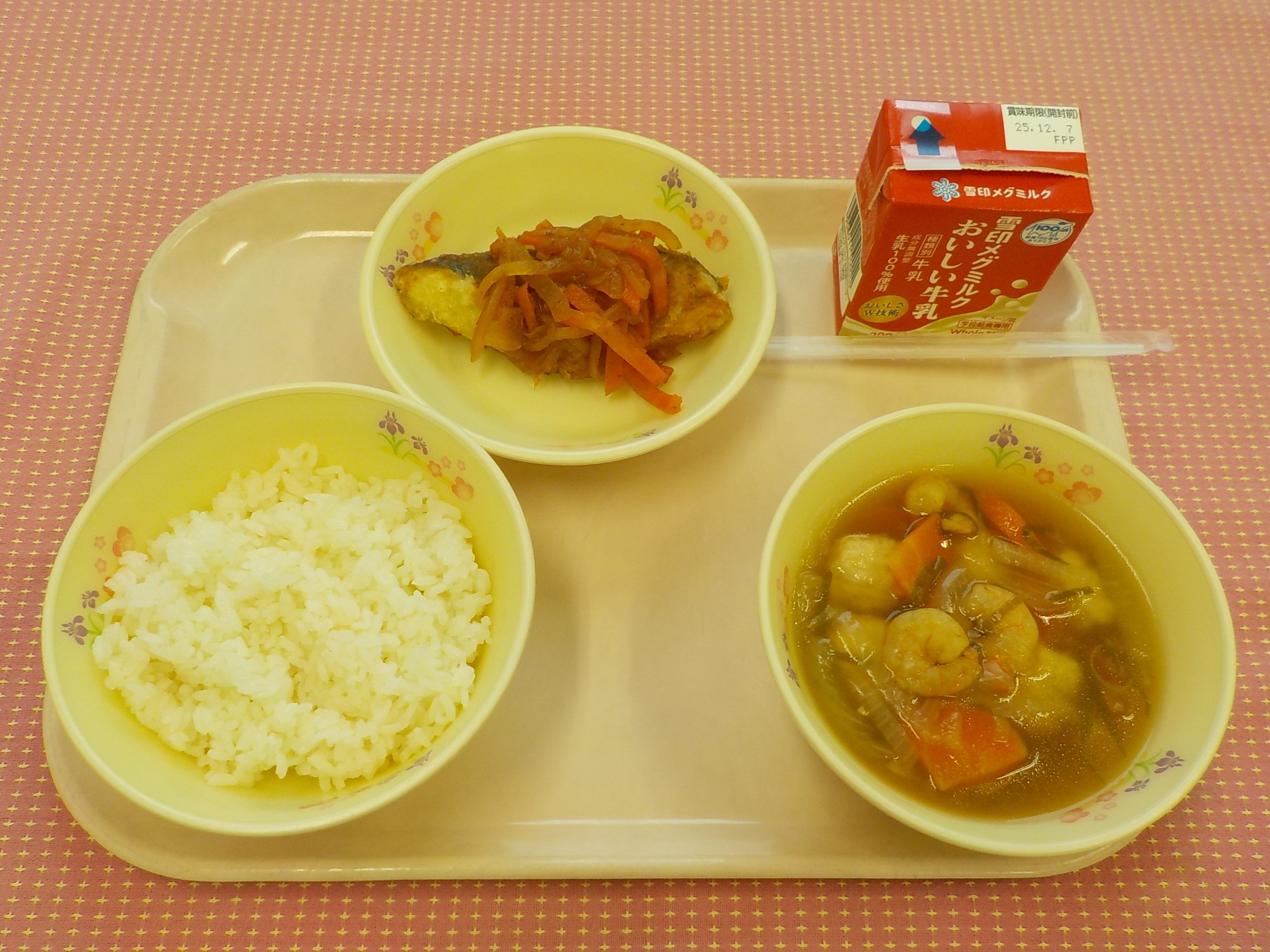 本日のメニューは、ごはん、牛乳、えびと鶏団子のスープ、
