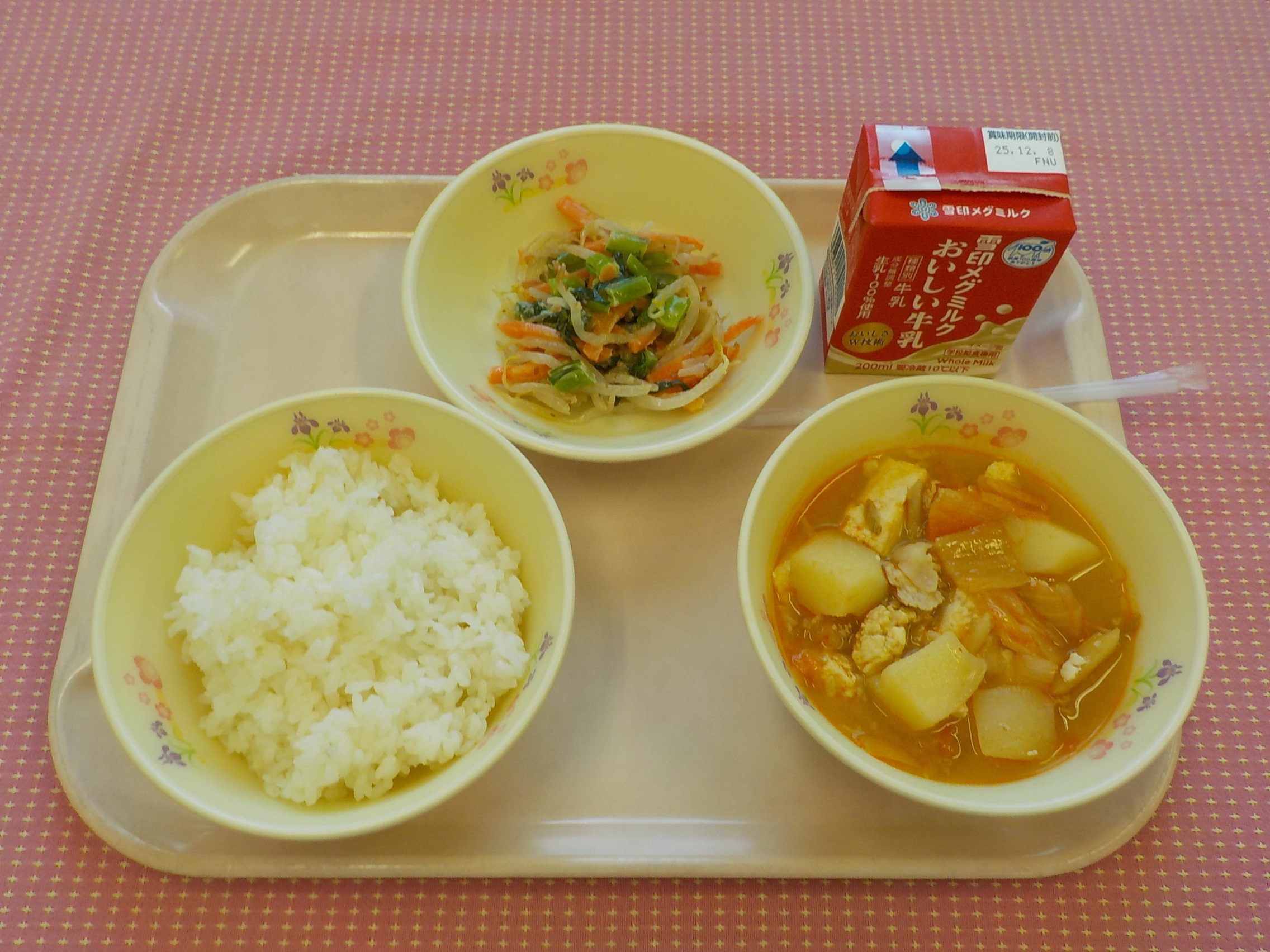 本日のメニューは、ごはん、牛乳、ぽかぽかじゃがチゲ、
