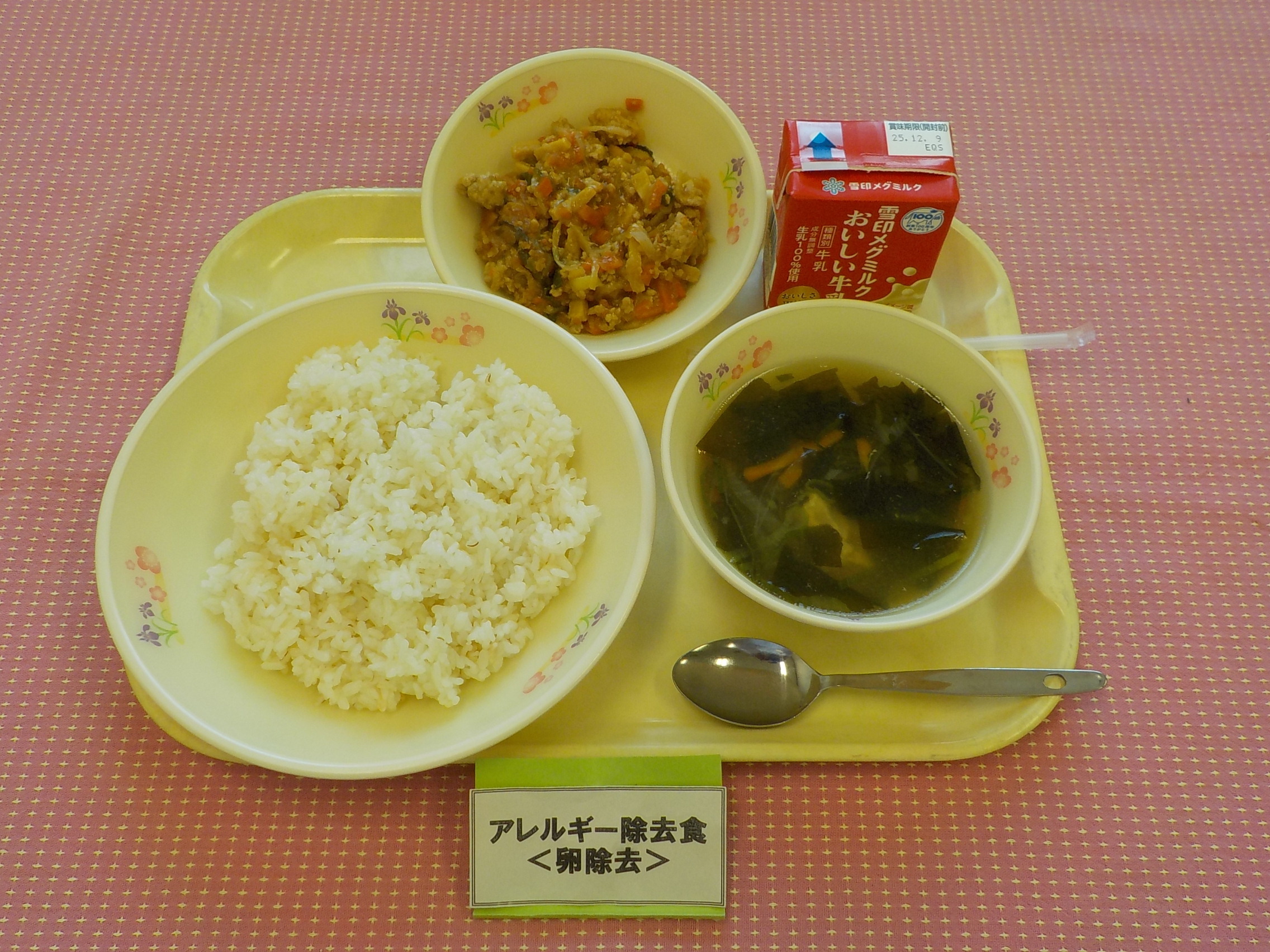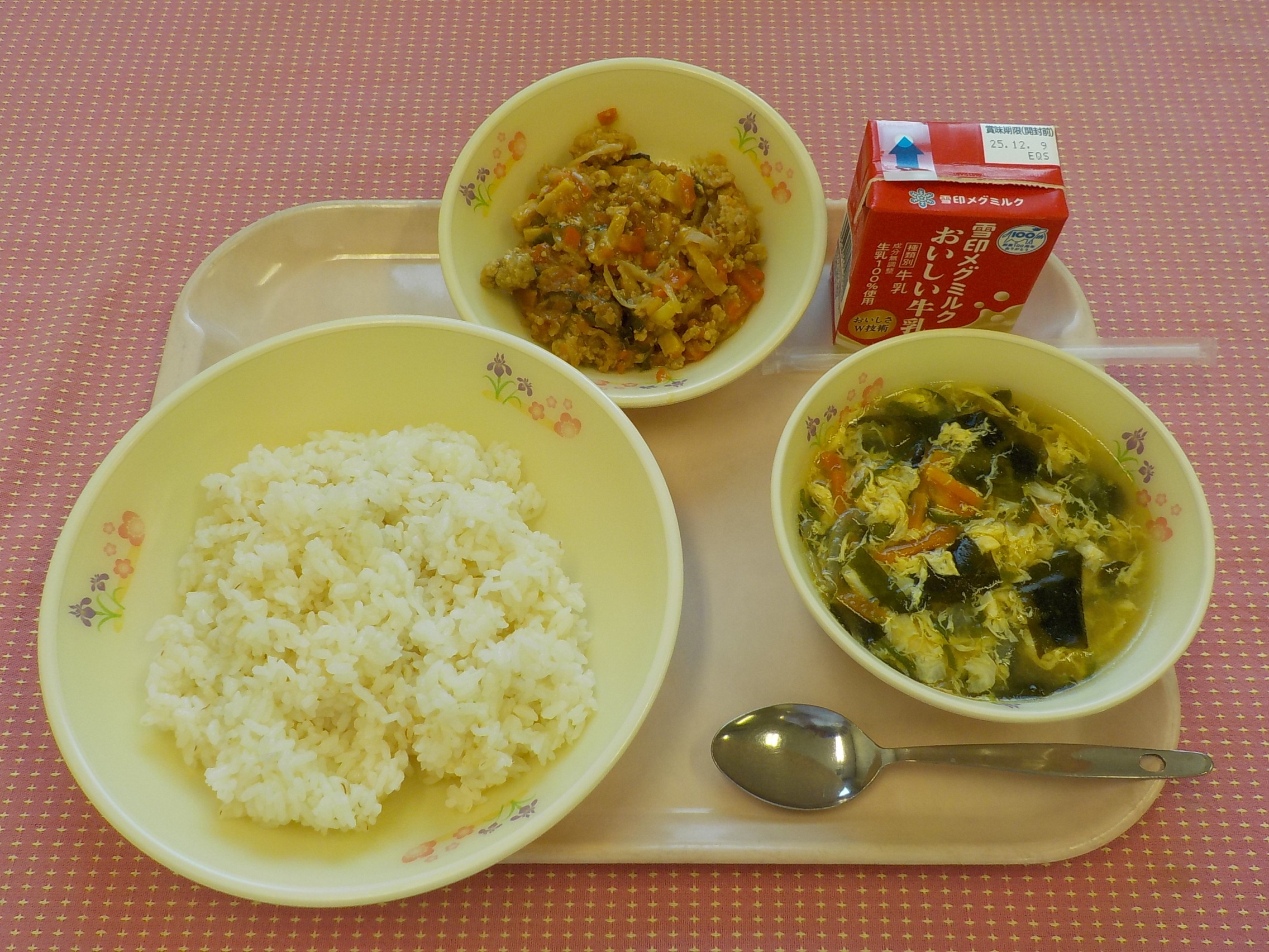 本日のメニューは、麦ごはん、牛乳、わかめと卵のスープ、