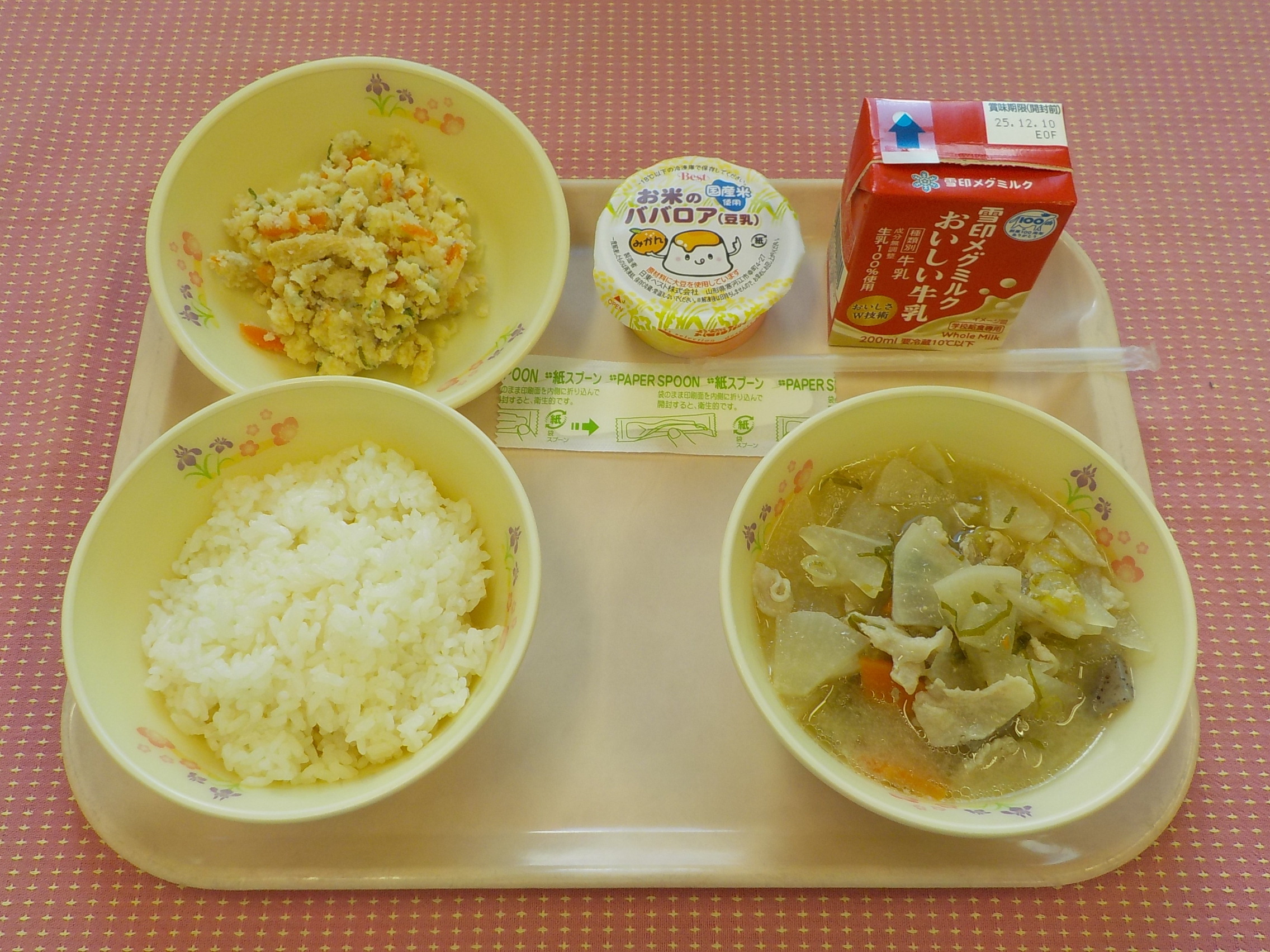 本日のメニューは、ごはん、牛乳、豚汁、卯の花の炒り煮、