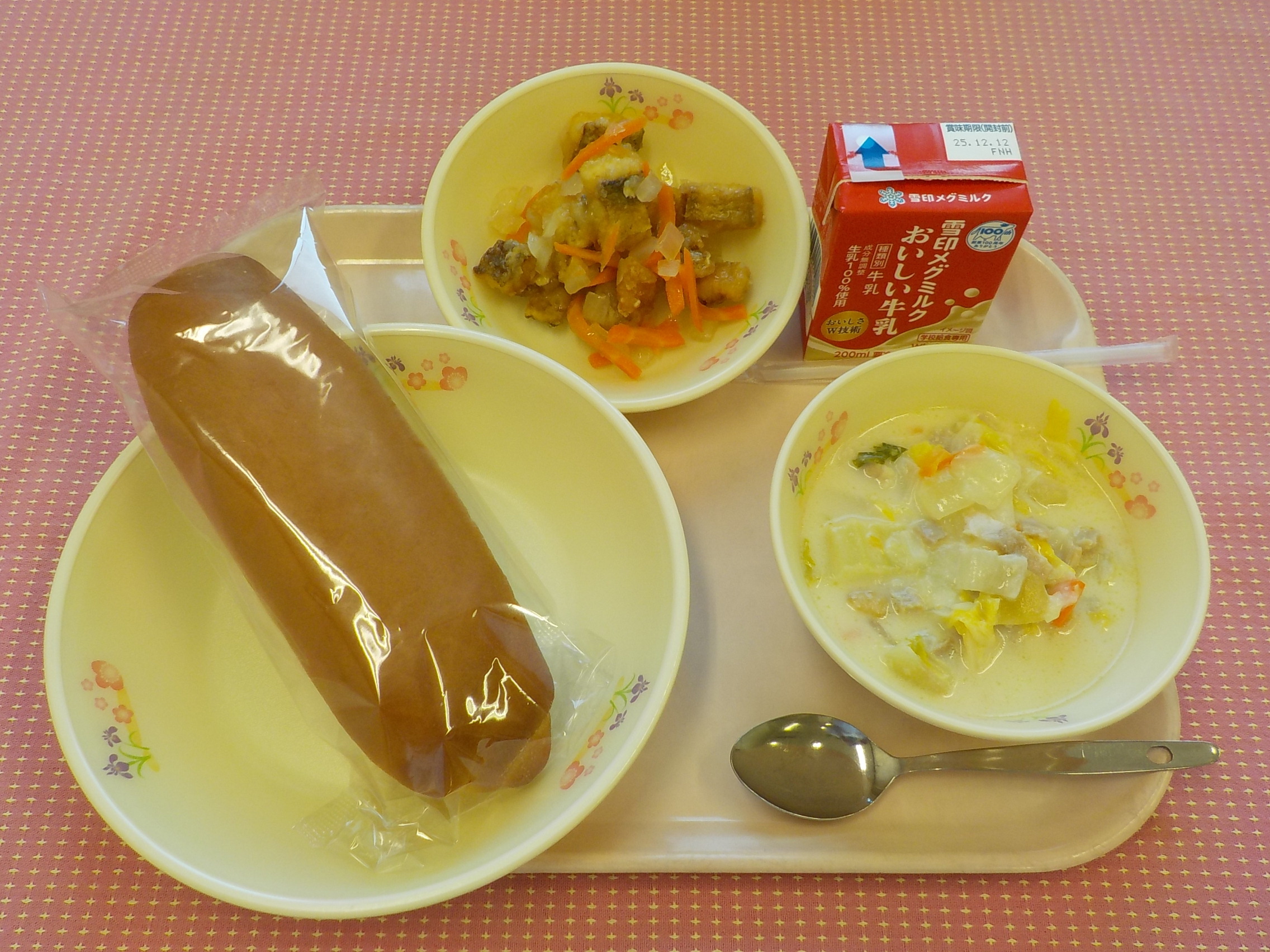 本日のメニューは、黒糖パン、牛乳、白菜のクリーム煮、