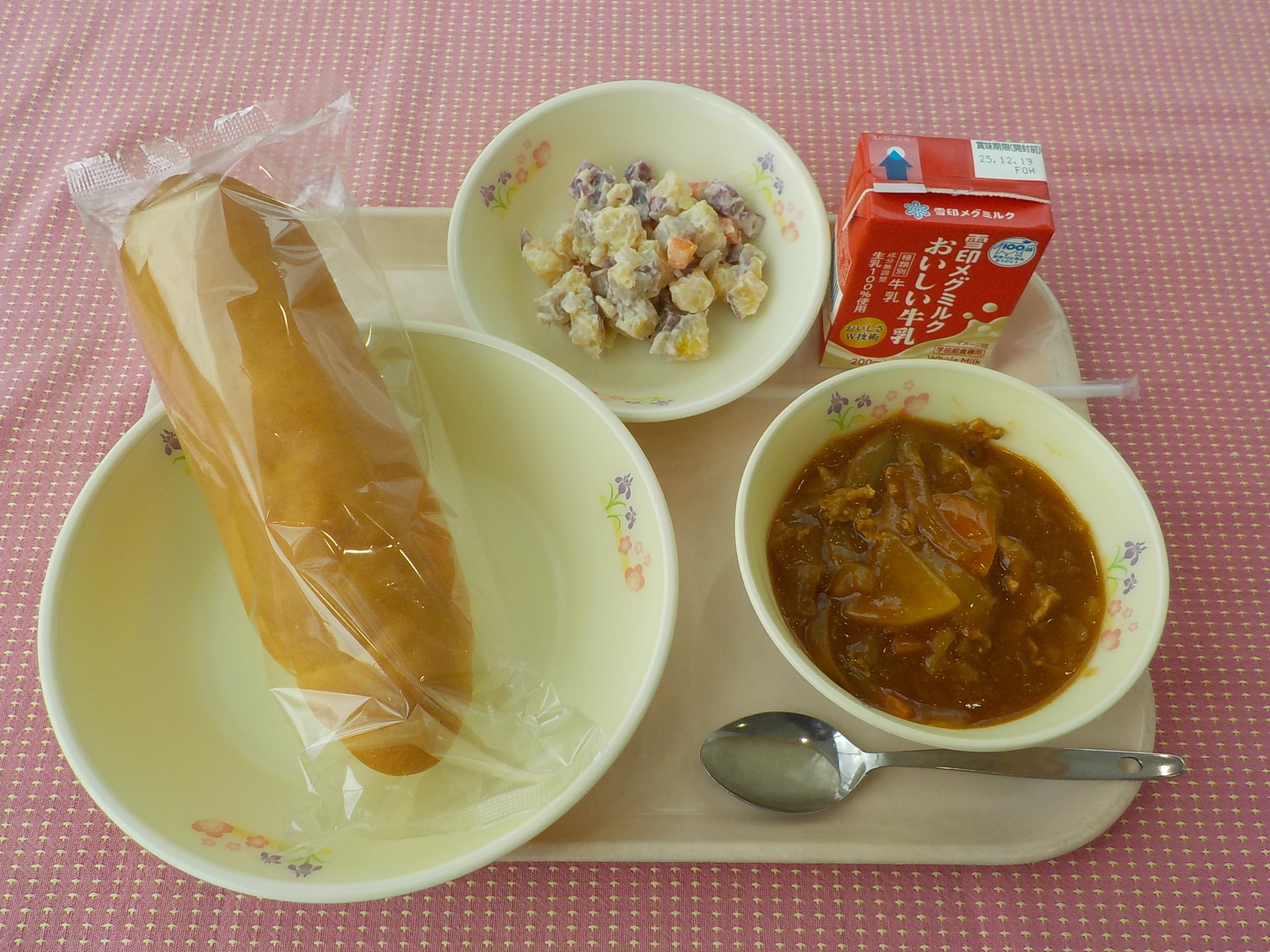 本日のメニューは、コッペパン、牛乳、冬野菜のブラウンシチュー、