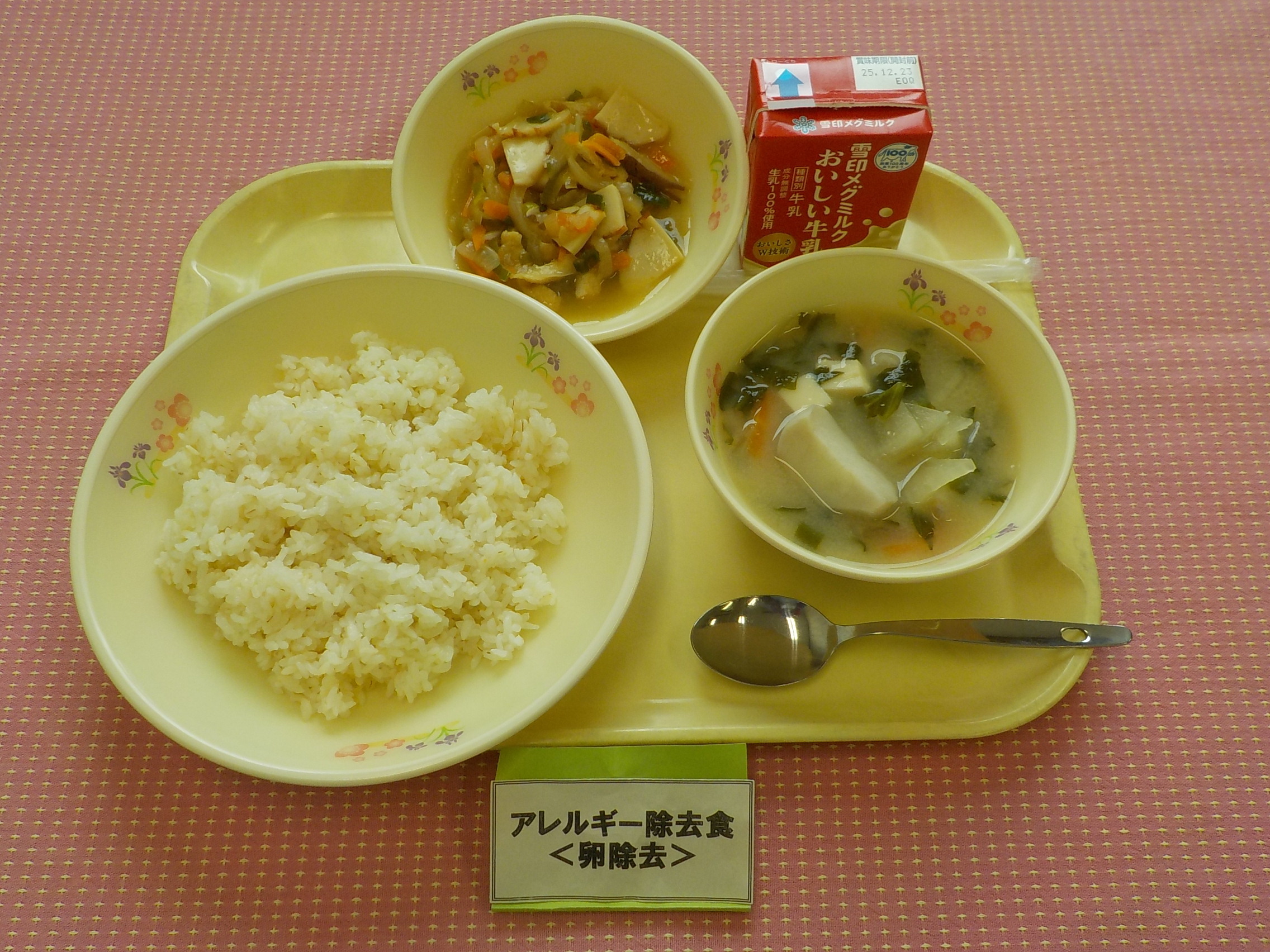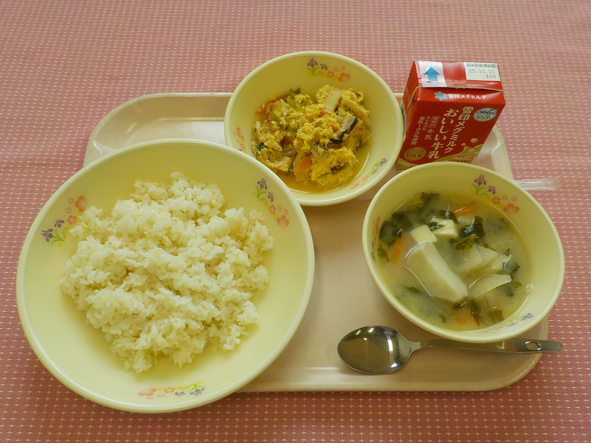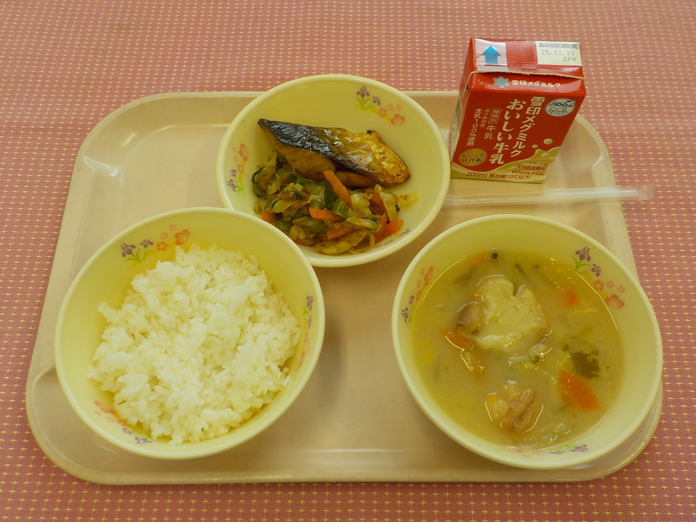 本日のメニューは、麦ごはん、牛乳、冬野菜のみそ汁、