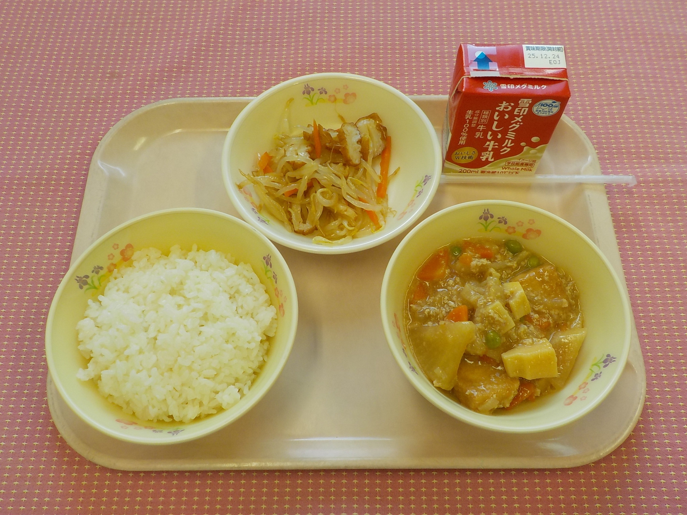 のメニューは、ごはん、牛乳、マーボー大根、もやしのナムル です。