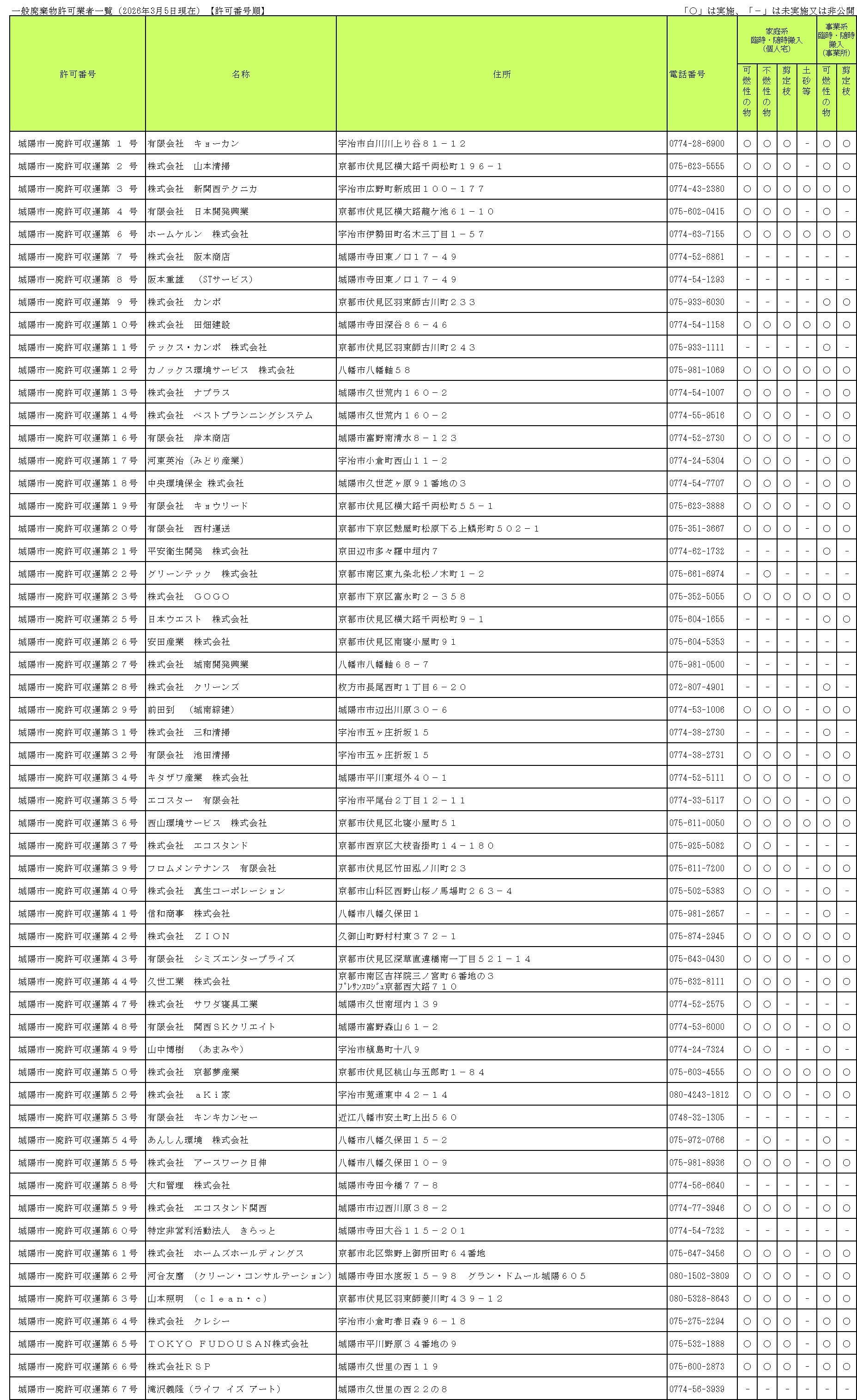 | 城陽市一廃許可収運第65号 | TOKYO FUDOUSAN株式会社 | 城陽市平川野原34ー9 | 075-532-1888 | 〇 | 〇 | 〇 | - |