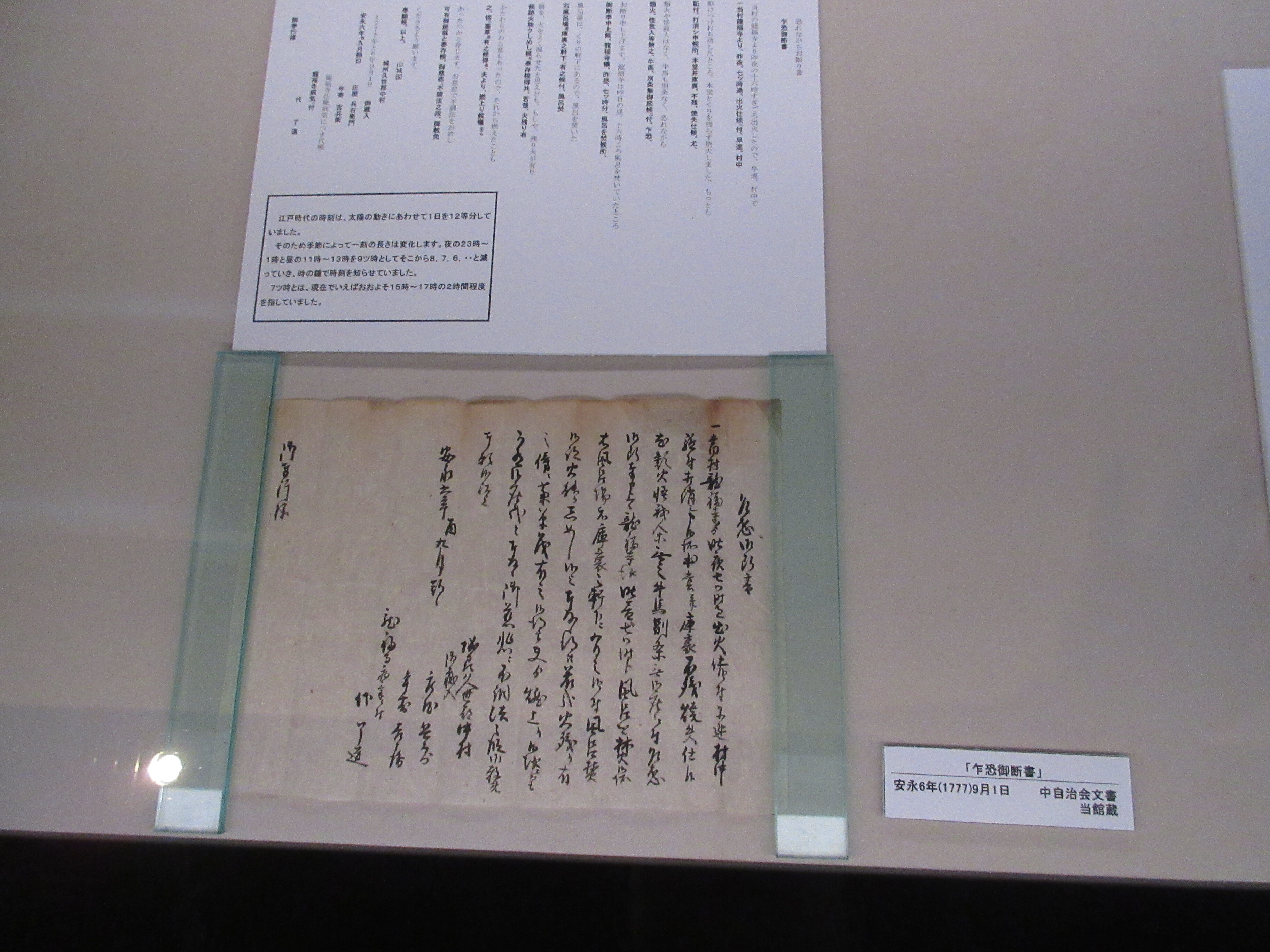 浄土宗の寺院である中村の龍福寺は、安永6(1777)年8月に、火災により寺が焼失してしまいます。今回は、その報告を庄屋から届け出た史料と再建された本堂の床下に犬除け垣築造を願い出た史料を展示します。