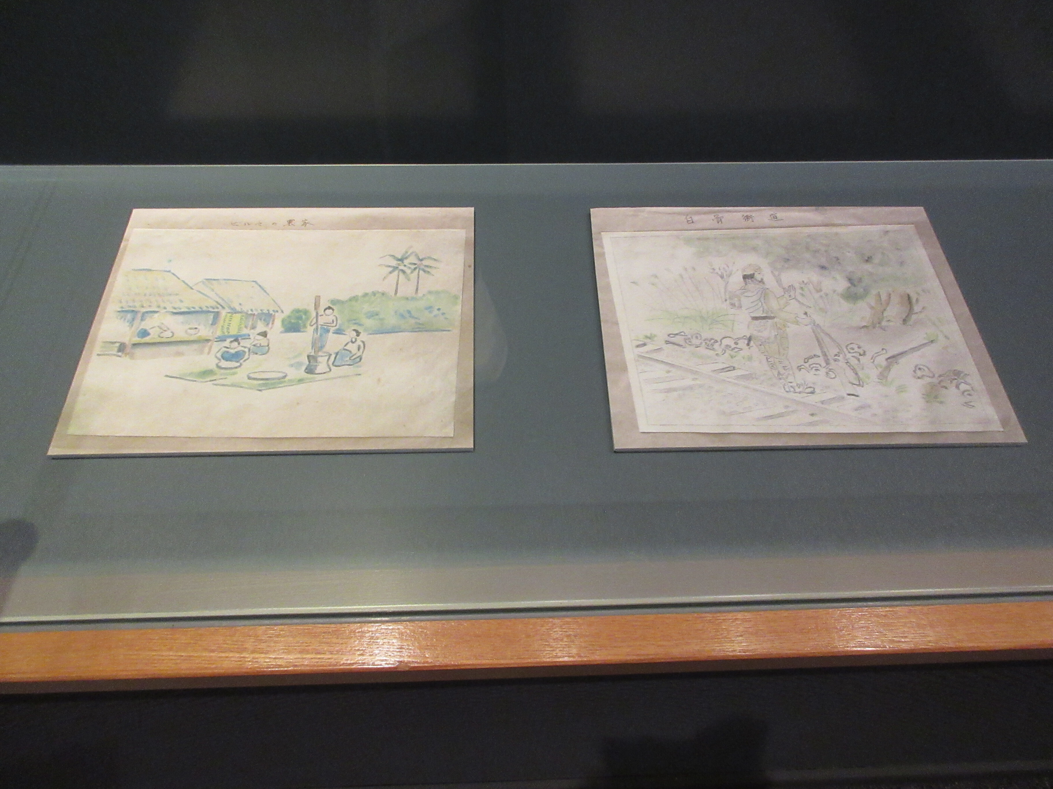 戦後80年の節目の年を迎え、戦争体験の次世代への継承が課題となっています。今年度の近代コーナーの年間テーマを「戦後80年」とし、収蔵する戦争関連資料を年間4回の展示替えをして紹介しています。1月から3月の3か月間はビルマの収容所で捕虜として抑留された故北村敏雄さんが現地で描いたスケッチを展示し、戦争とは何かを考えます。