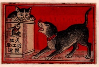 古来から馴染みの深い犬や猫も、レッテルのモチーフとして登場しています。特に猫は「招き猫」としても描かれており、いずれも縁起のよいものが選ばれています。