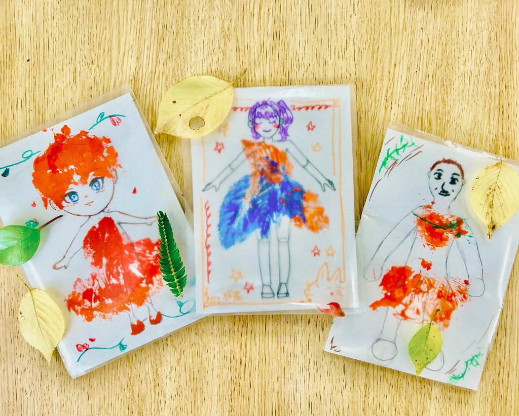 絵の具を使った葉っぱのスタンプでモデルさんに色とりどりな服や帽子を着せてあげよう。
