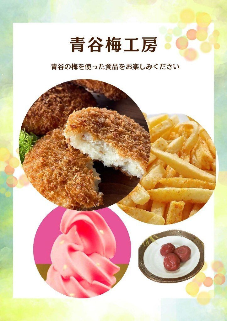 梅コロッケ、梅ソフトクリーム、ふりふりポテトと梅唐揚げ。梅の郷青谷事業特産品部会との協同開発の梅コーラ等の販売もします。