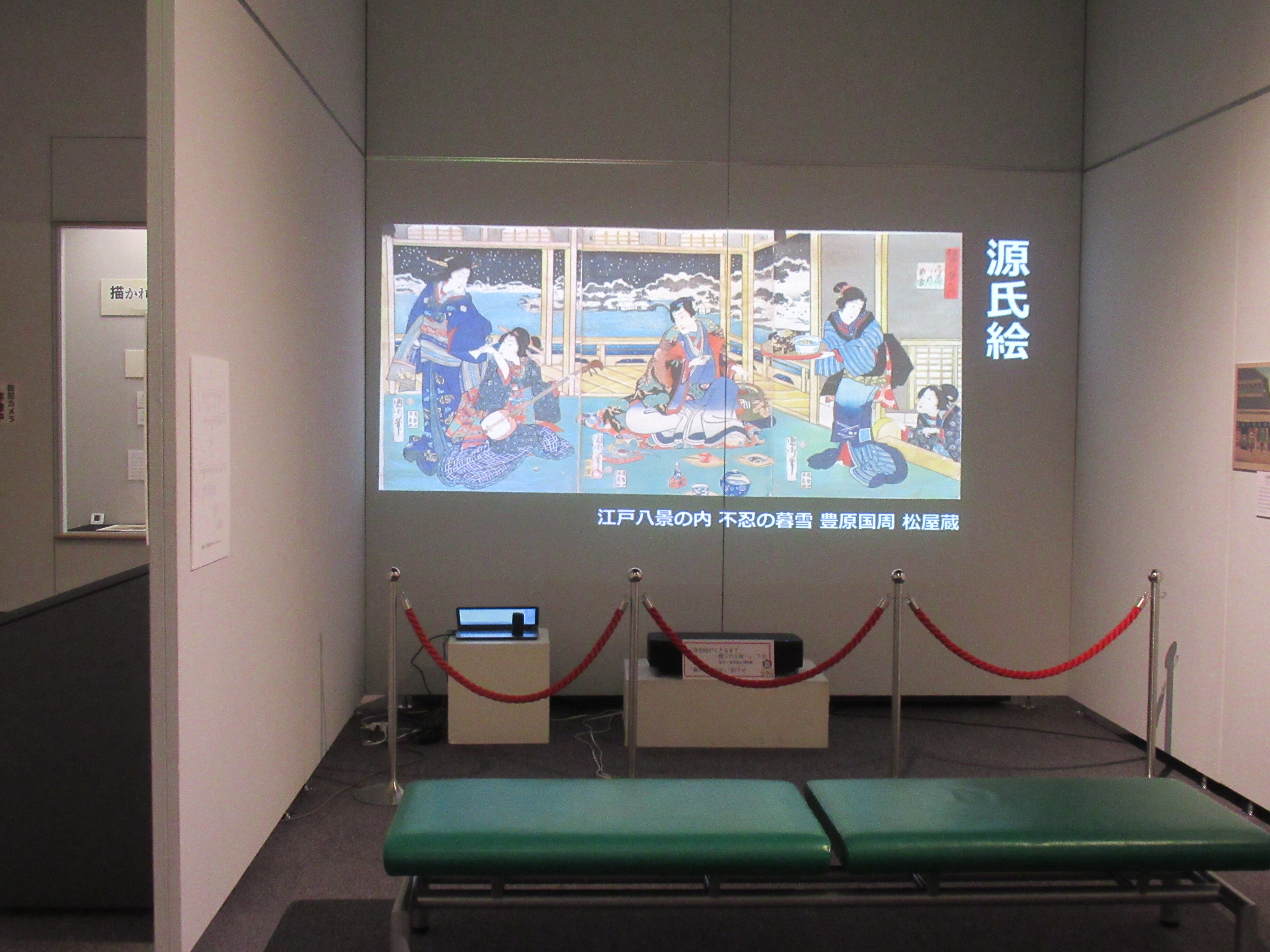 展示室中央にプロジェクターを設置し、今回の展示で扱う錦絵すべてを拡大投影します。また、東京国立博物館制作の「浮世絵ができるまで ~摺りの工程~」の動画も放映します。どのように錦絵はつくられたのか、制作行程のうち「摺り」についてご紹介します。