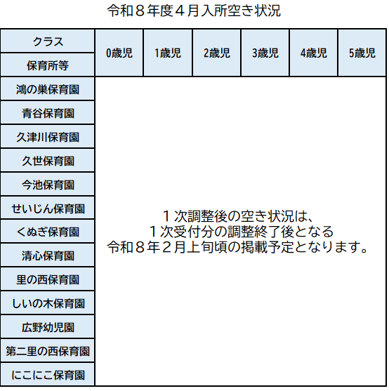 ●1次受付の調整が終了する令和8年2月上旬頃から2次受付の終了となる令和8年2月9日(月)までの期間に、2次受付分の空き状況をページ下部に掲載する予定です