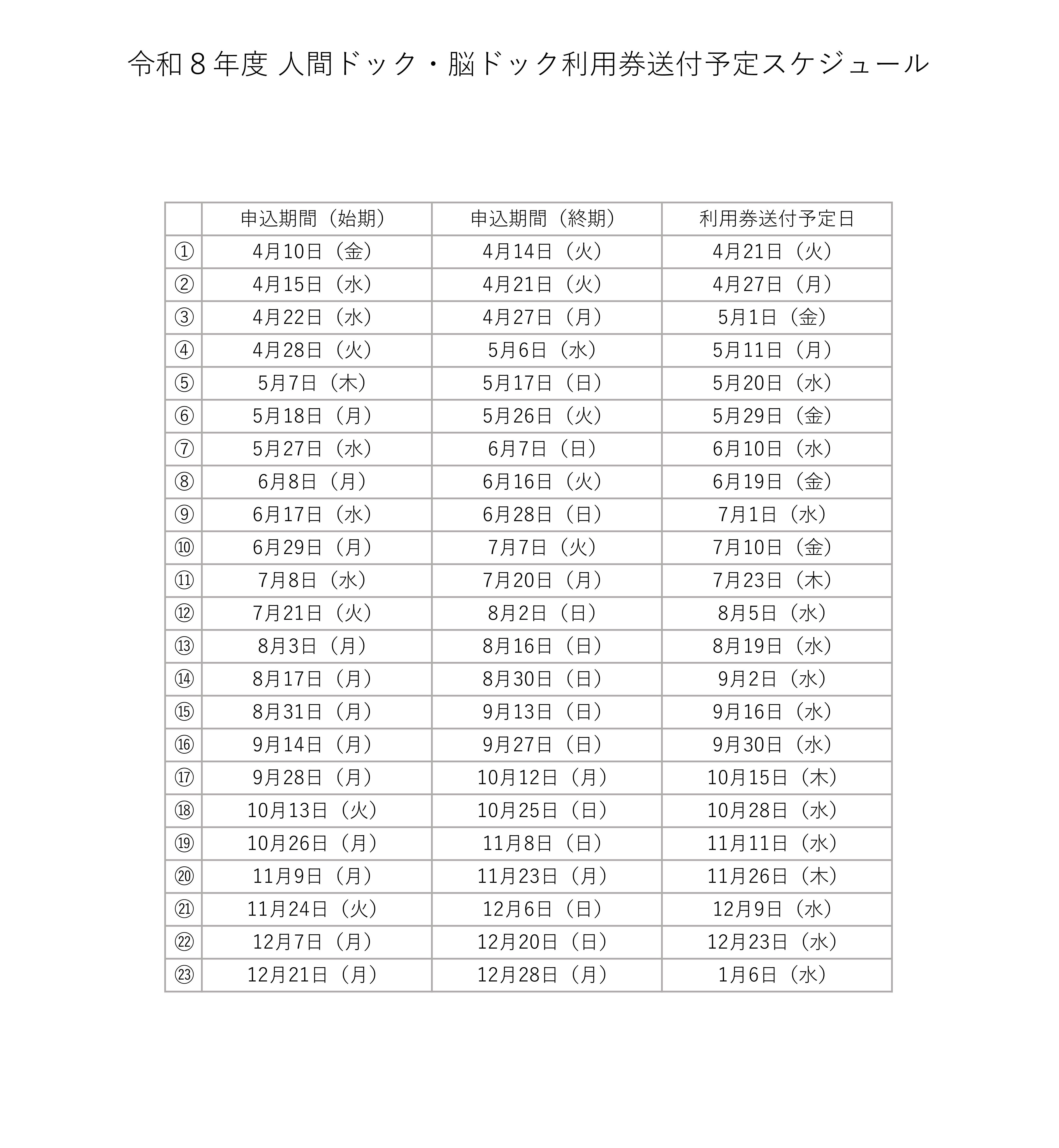| 注意事項 | ・ドック受診に必要な利用券は、申込受付後約2週間程度で郵送します。下記「利用券送付予定スケジュール」を目安に送付しますのでご確認ください。 ・利用券の有効期限(受診期間)は令和9年3月31日までです。 ・今年度人間ドックの補助を受ける人は、特定健診(特定健康診査)や健康診査および各種がん(大腸がん、胃がん、肺がん)検診を受診できません(人間ドックと特定健診等の両方を受診した場合、特定健診等は全額自己負担)。 ・市が実施する胃がん検診は隔年実施で、今年度は西暦偶数年生まれの人が対象になります。検査方法は「胃内視鏡検査(50歳以上)」または「バリウムによる胃部X線検査(40歳以上)」のどちらかを選択できます。 ・申込前に受診した費用は補助できません。 ・前年度に国民健康保険のドック補助に申し込みしキャンセルした人でキャンセルの連絡を市にしていない人は、申込時に前年度の利用券を返却してください。返却がないと、補助を受けられない場合があります。 ・受診時点で国民健康保険の資格を喪失している場合は、受診していただけません(75歳になられた等により後期高齢者医療に加入された場合を除く)。 | 同左 |