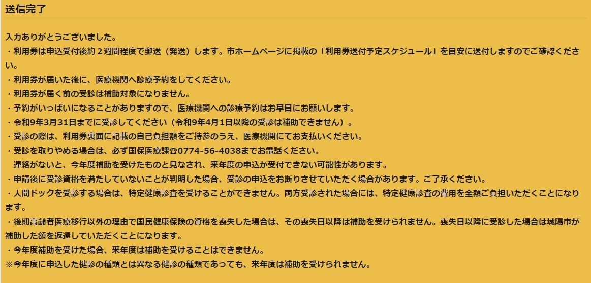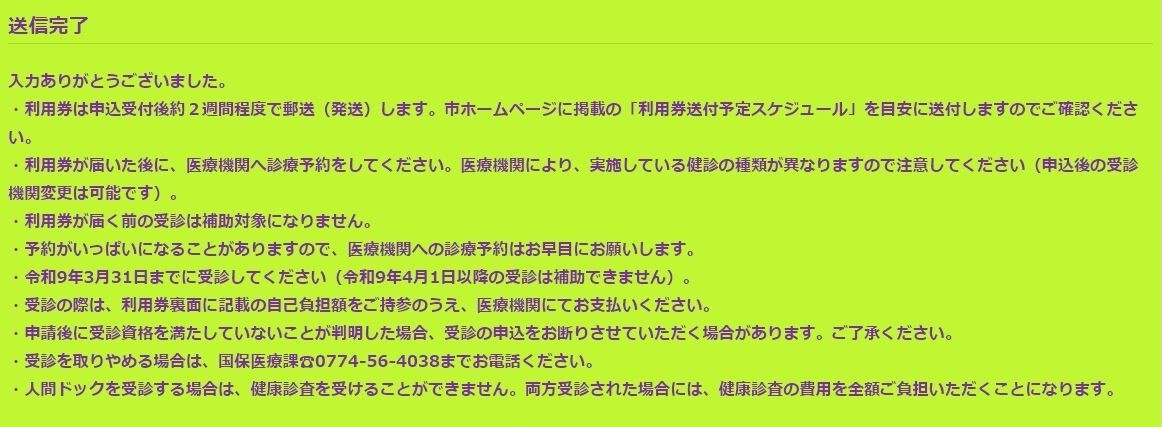 〒610-0195 城陽市寺田東ノ口16番地、17番地 城陽市国保医療課 人間ドック担当あて
