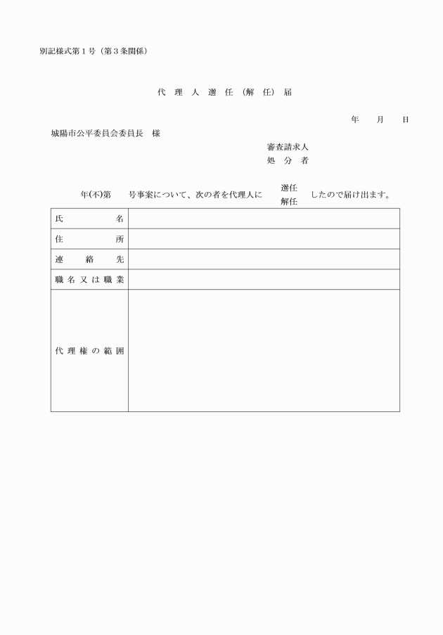 3 当事者は、代理人を選任し、又は解任したときは、代理人選任(解任)届(別記様式第1号)を公平委員会に提出しなければならない。