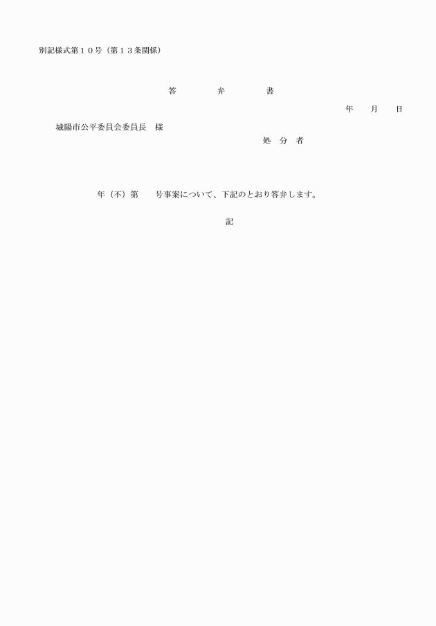 第13条 公平委員会は、処分者に対し、期限を定めて、処分の理由に関する具体的な説明及び審査請求人の主張に対する答弁を記載した答弁書(別記様式第10号)の提出を求めるものとする。