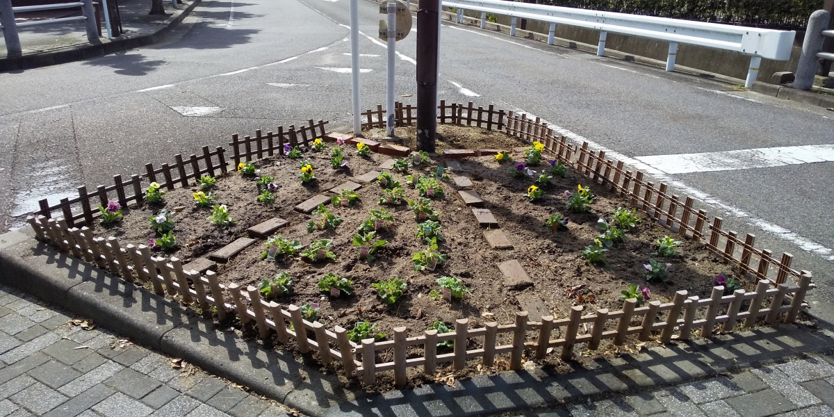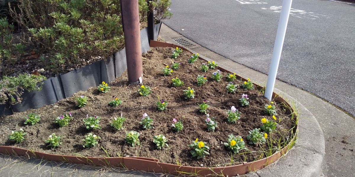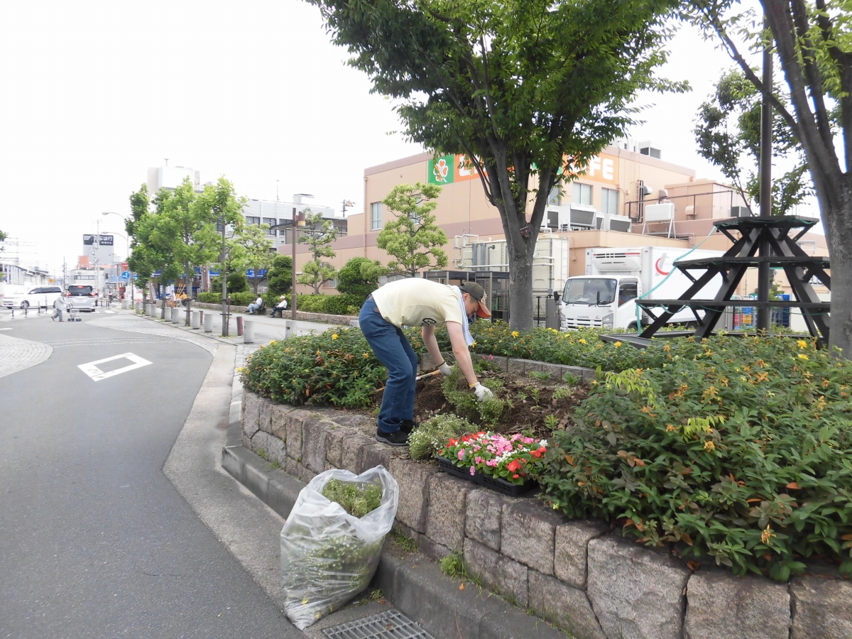 寺田駅東側駅前広場の植樹帯及び花壇の花の植替えを行いました。