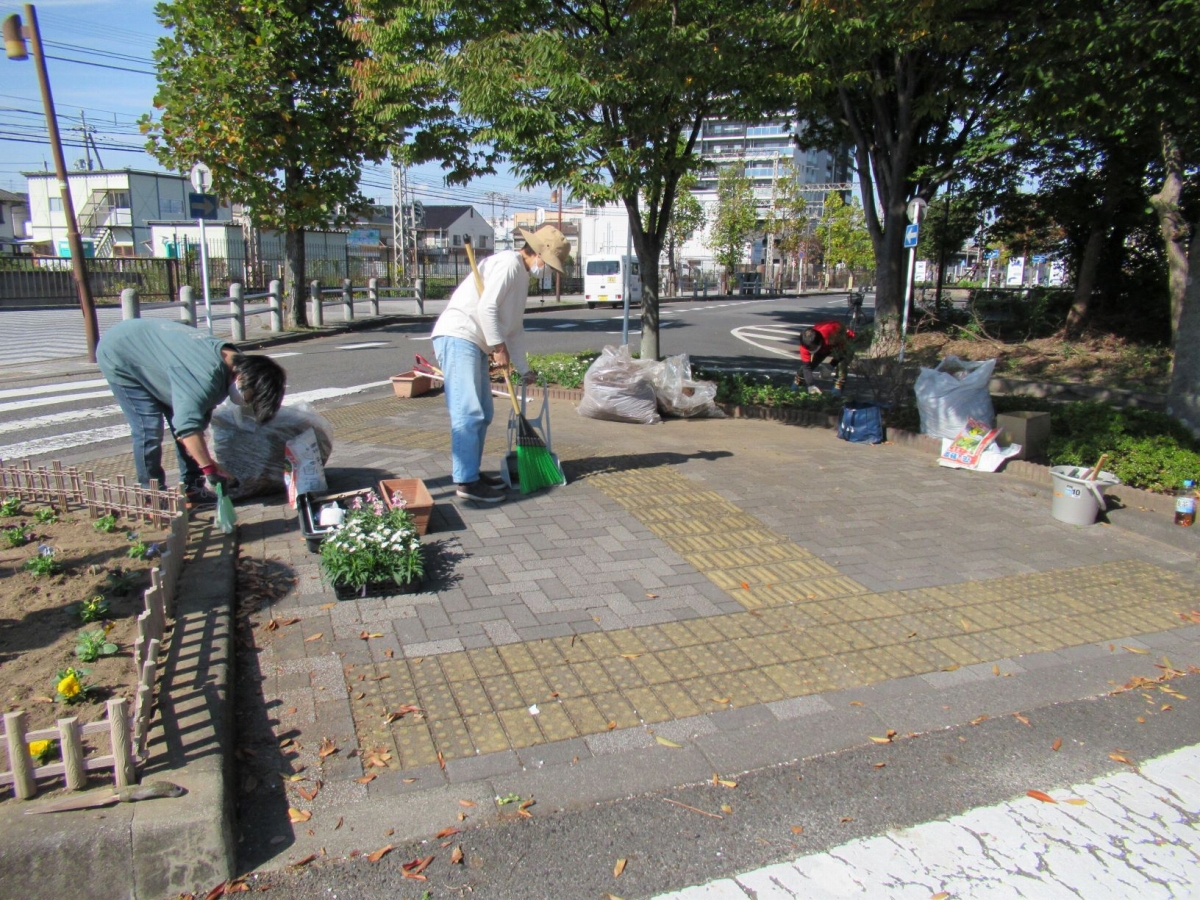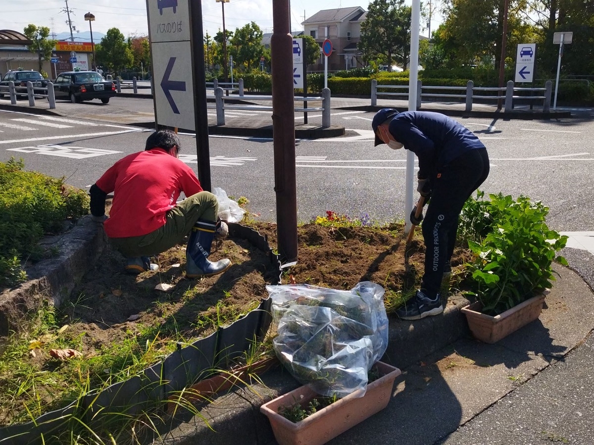 寺田駅東側駅前広場の植樹帯及び花壇の花の植替えを行いました。
